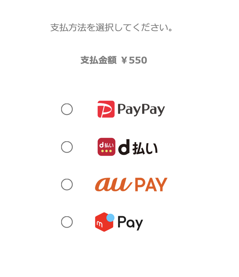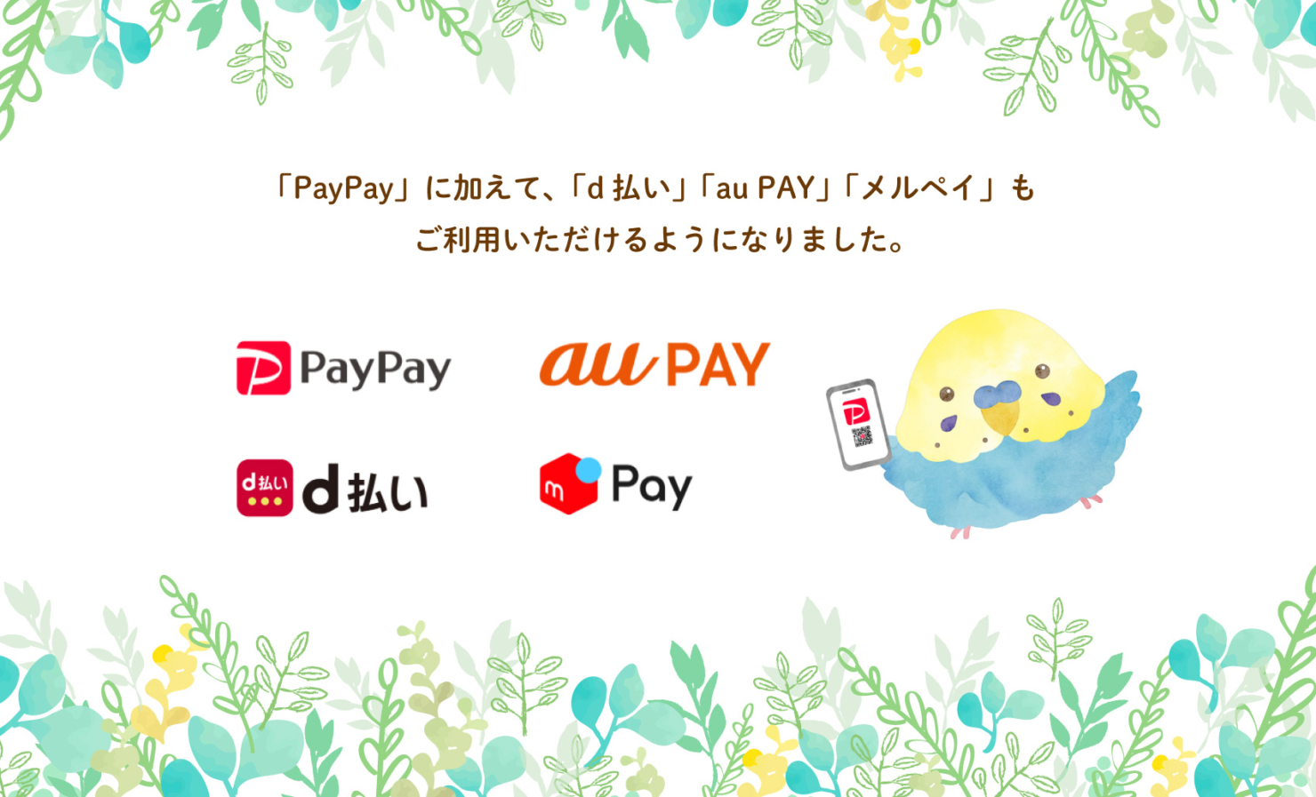 「PayPay」に加えて、「d払い」「au PAY」「メルペイ」もご利用いただけるようになりました。