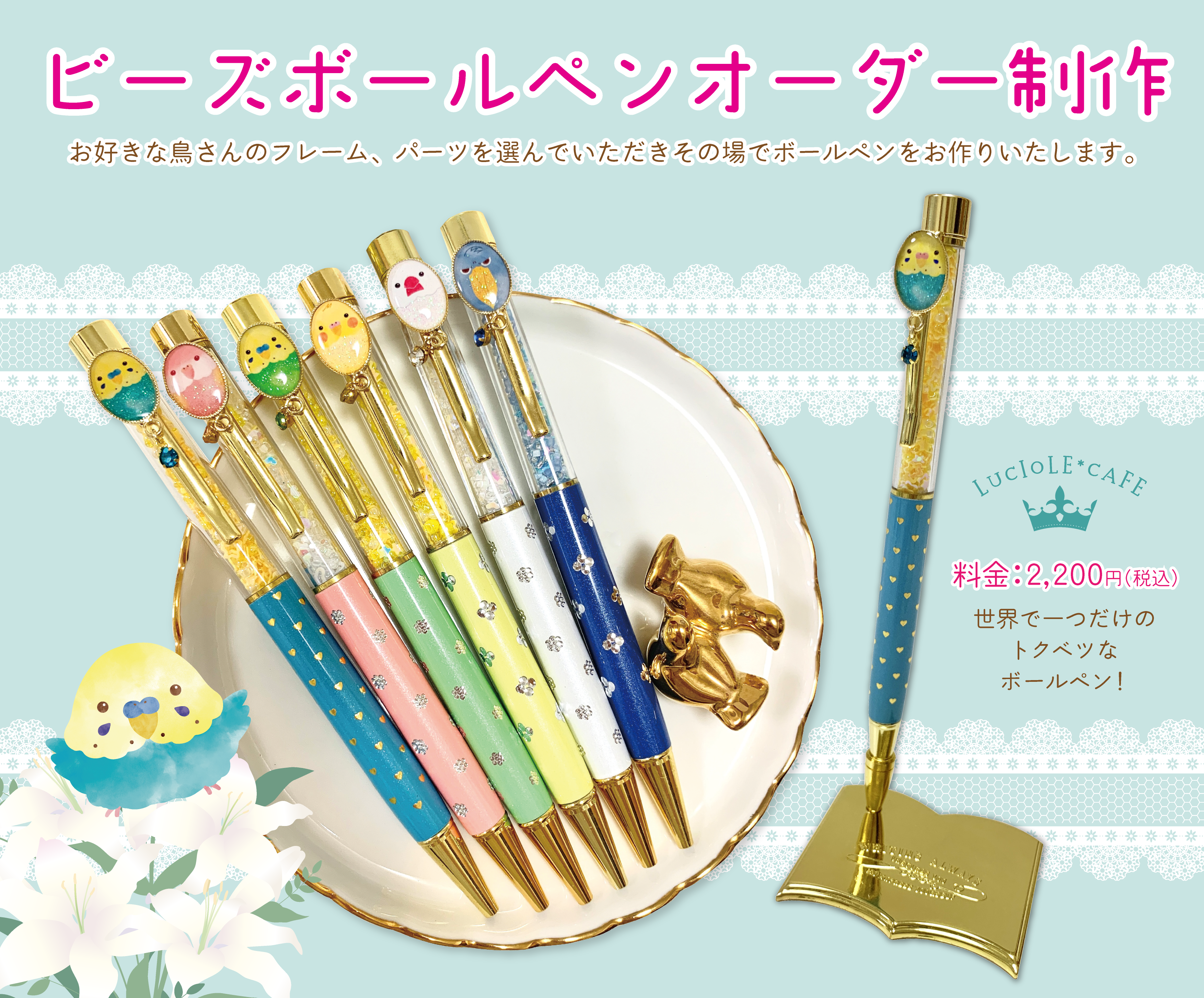 お好きな【ビーズ】【ペン軸】【キャップ】【ストーンチャーム】のカラーを自由に選んで、その場でカスタム!